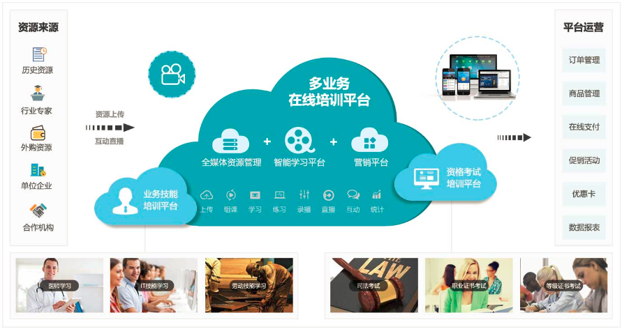 多業(yè)務(wù)在線培訓(xùn)云平臺(tái)是利用大數(shù)據(jù)、云計(jì)算、人工智能、區(qū)塊鏈等先進(jìn)互聯(lián)網(wǎng)技術(shù)開發(fā)的一套適合行業(yè)出版社、政府、央企等大型單位同時(shí)在線開展崗位培訓(xùn)、技能培訓(xùn)、考試培訓(xùn)、在線學(xué)習(xí)、繼續(xù)教育以及在線評(píng)估等多種在線培訓(xùn)業(yè)務(wù)的綜合業(yè)務(wù)教育服務(wù)云平臺(tái)??蓭椭袠I(yè)出版社、政府、央企建立從學(xué)生教育到就業(yè)培訓(xùn)、從上崗培訓(xùn)到崗位升級(jí)培訓(xùn)、從職場(chǎng)新人到專業(yè)大師的階梯化教育生態(tài)體系。