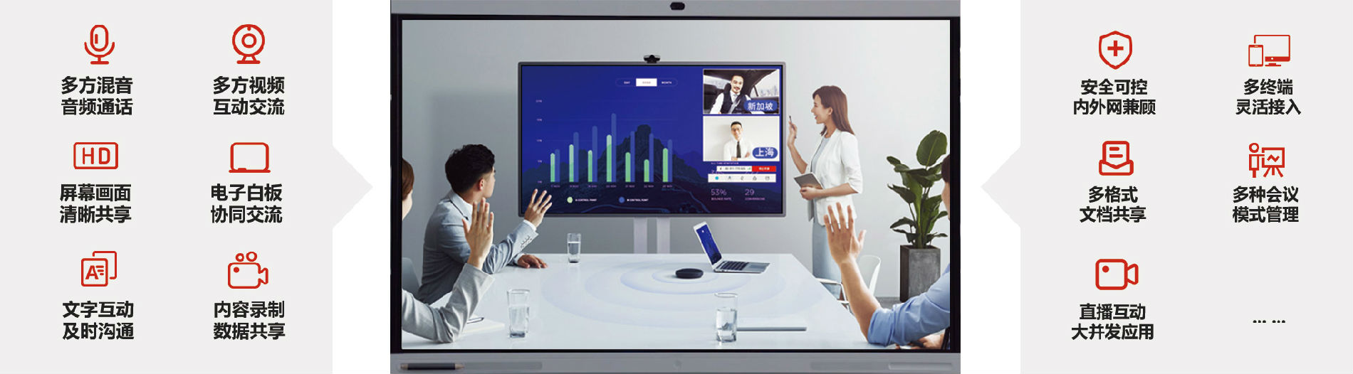 采用WEBRTC技術研發(fā),支持鼎新云智慧屏與PC、智能手機等多種不同終端互聯(lián)互通,支持500人以上在線視頻會議,支持屏幕文檔共享,支持會議場景錄制及直播分發(fā)等。