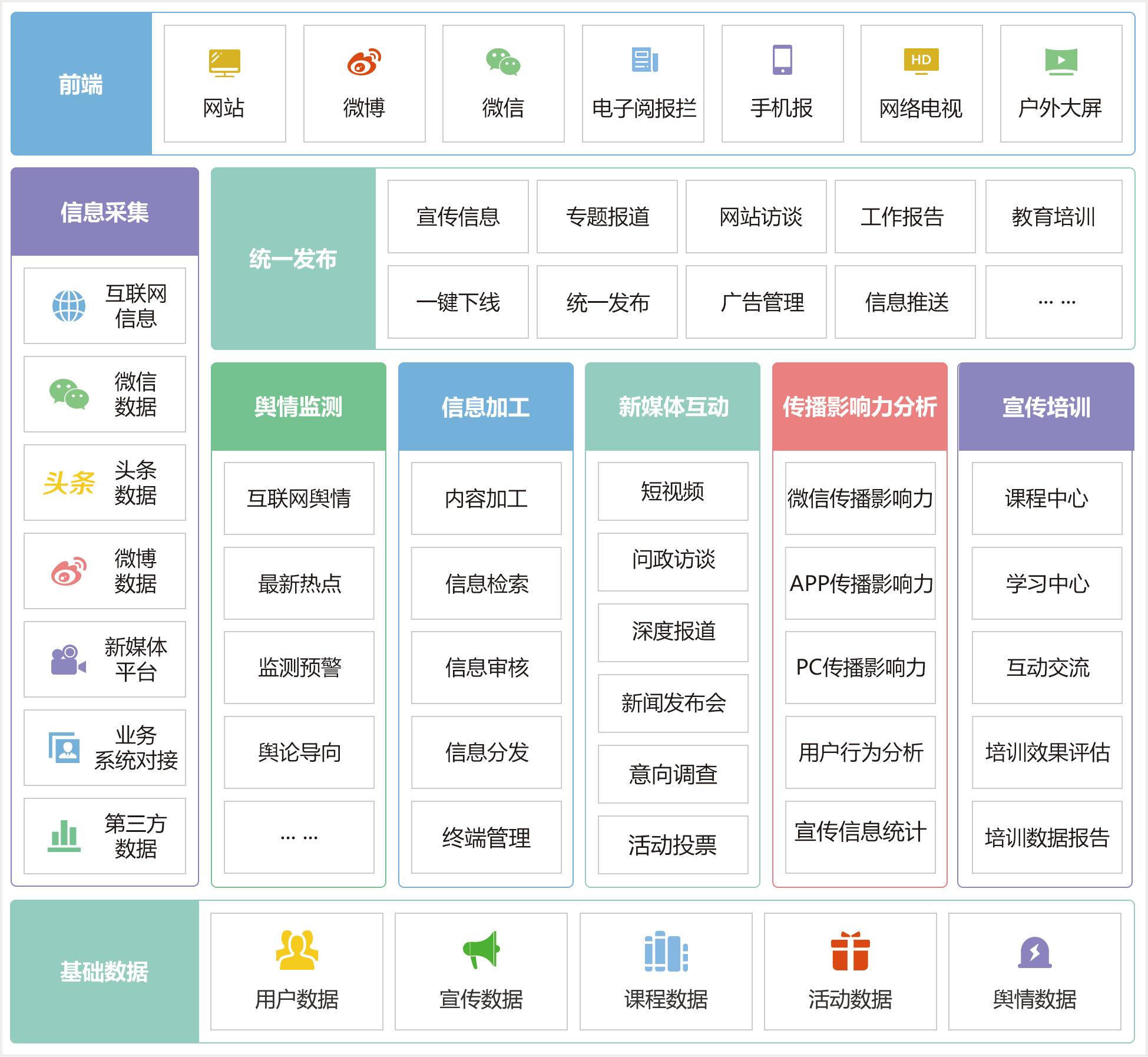 黨的十八大以來(lái),以習(xí)近平同志為核心的黨中央作出推動(dòng)傳統(tǒng)媒體和新興媒體融合發(fā)展的戰(zhàn)略部署,推動(dòng)黨的聲音直接進(jìn)入各類用戶終端,提升個(gè)性化生產(chǎn)、可視化呈現(xiàn)、智能化推送、互動(dòng)化傳播水平,努力占領(lǐng)新的輿論場(chǎng),全面提高輿論引導(dǎo)能力,是習(xí)近平總書記對(duì)我們提出的新要求、新期待。北京鼎新云科技發(fā)展有限公司利用人工智能、大數(shù)據(jù)、移動(dòng)互聯(lián)等新媒體技術(shù)為各級(jí)政府、企業(yè)、部隊(duì)等單位搭建智能化融合宣教平臺(tái),平臺(tái)通過一次性采集、個(gè)性化制作、可視化呈現(xiàn)、多渠道發(fā)布、互動(dòng)化傳播等業(yè)務(wù)模塊, 借助網(wǎng)站、微博、微信、電子閱報(bào)欄、手機(jī)報(bào)、網(wǎng)絡(luò)電視、戶外大屏等各類終端,實(shí)現(xiàn)多渠道內(nèi)容宣傳教育的融合傳播體系。