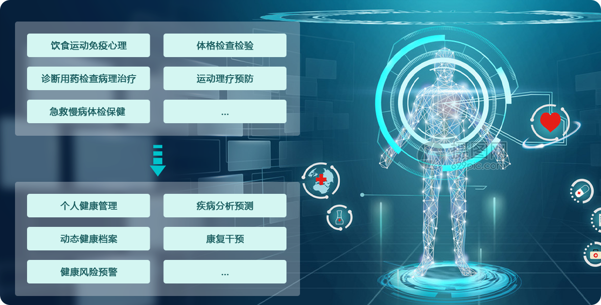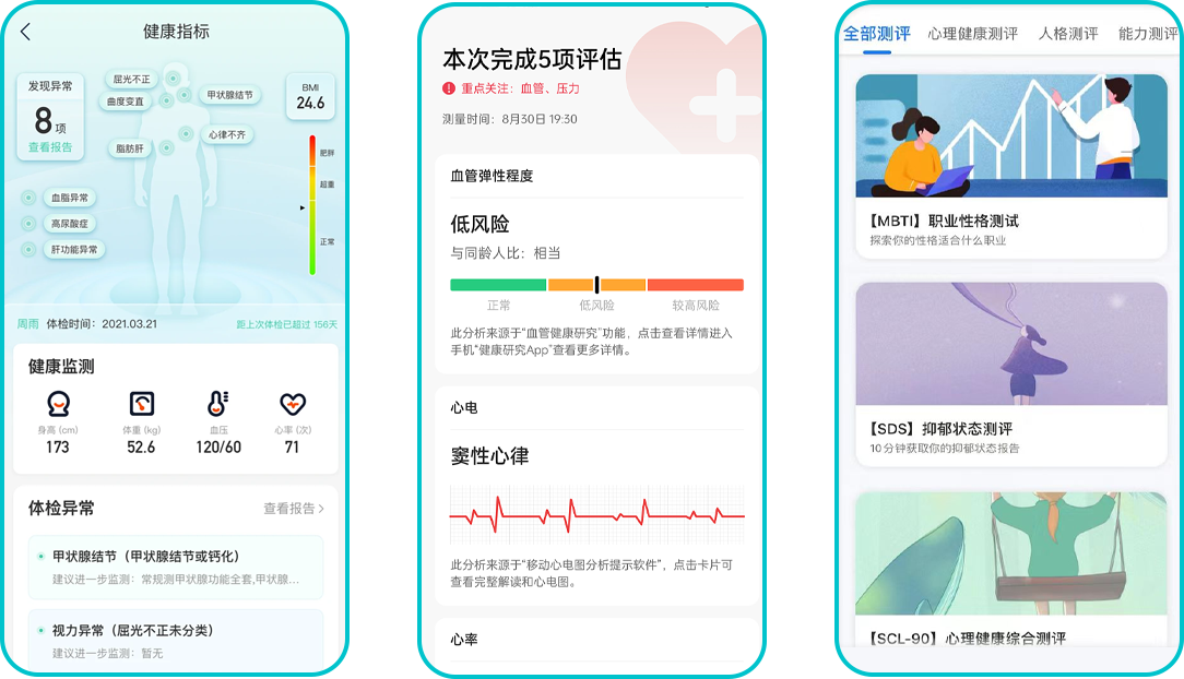 為用戶和家庭提供體質(zhì)辨識、設(shè)備檢測、身體狀況、心理健康、風(fēng)險預(yù)測等多種健康監(jiān)測模型,快速體現(xiàn)身體各項 健康指數(shù),給后續(xù)專業(yè)醫(yī)療機構(gòu)干預(yù)和診療提供專業(yè)意見。