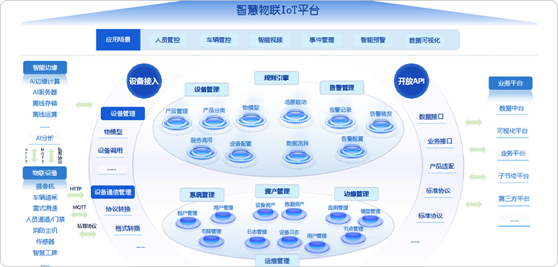 攝像機(jī)、車輛道閘、雷士測(cè)速、人員通道/門禁、消防主機(jī)、傳感器、智慧工牌等不同設(shè)計(jì)統(tǒng)一接入管理
